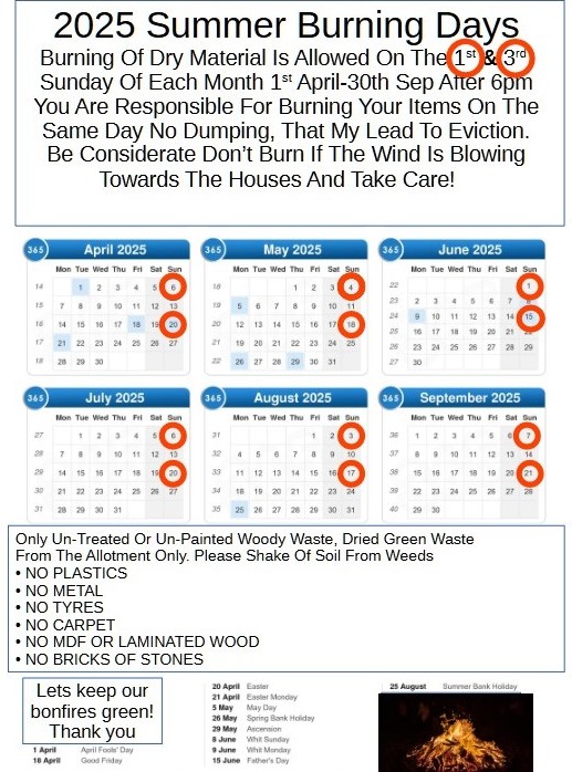 Please do bear in mind that there are houses very nearby, and only burn material on the days set out. Green material, such as weeds will smoke while burning, and is not allowed. Please burn only garden waste from the allotment (including wood or cardboard).